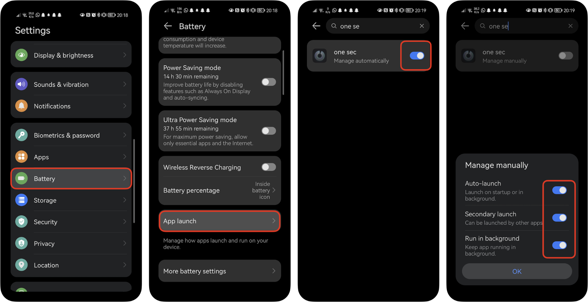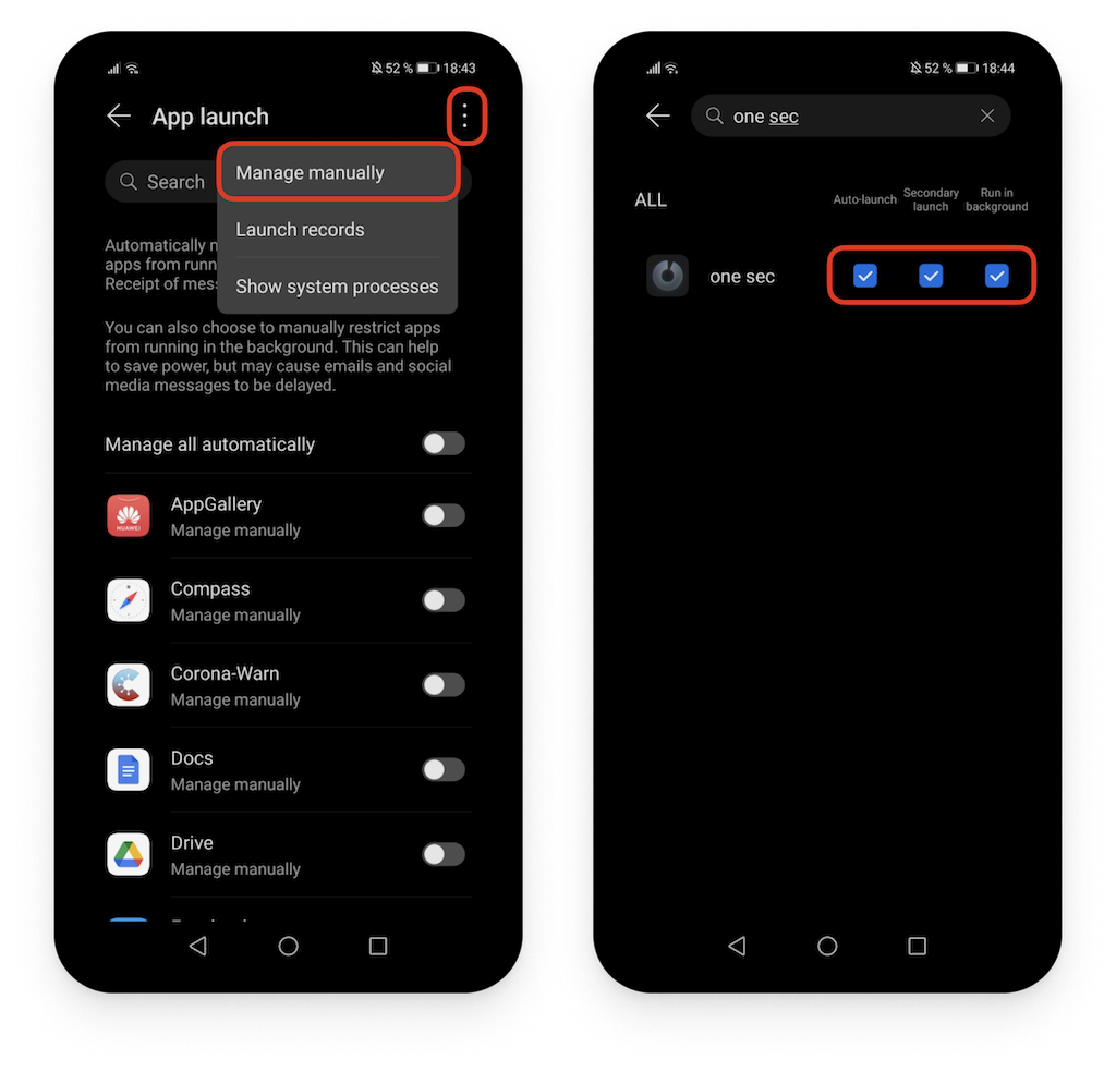 Go to your phone’s Settings → Battery → App launch → search for one sec and turn off “Manage all automatically” → Make sure to ENABLE! all toggles.