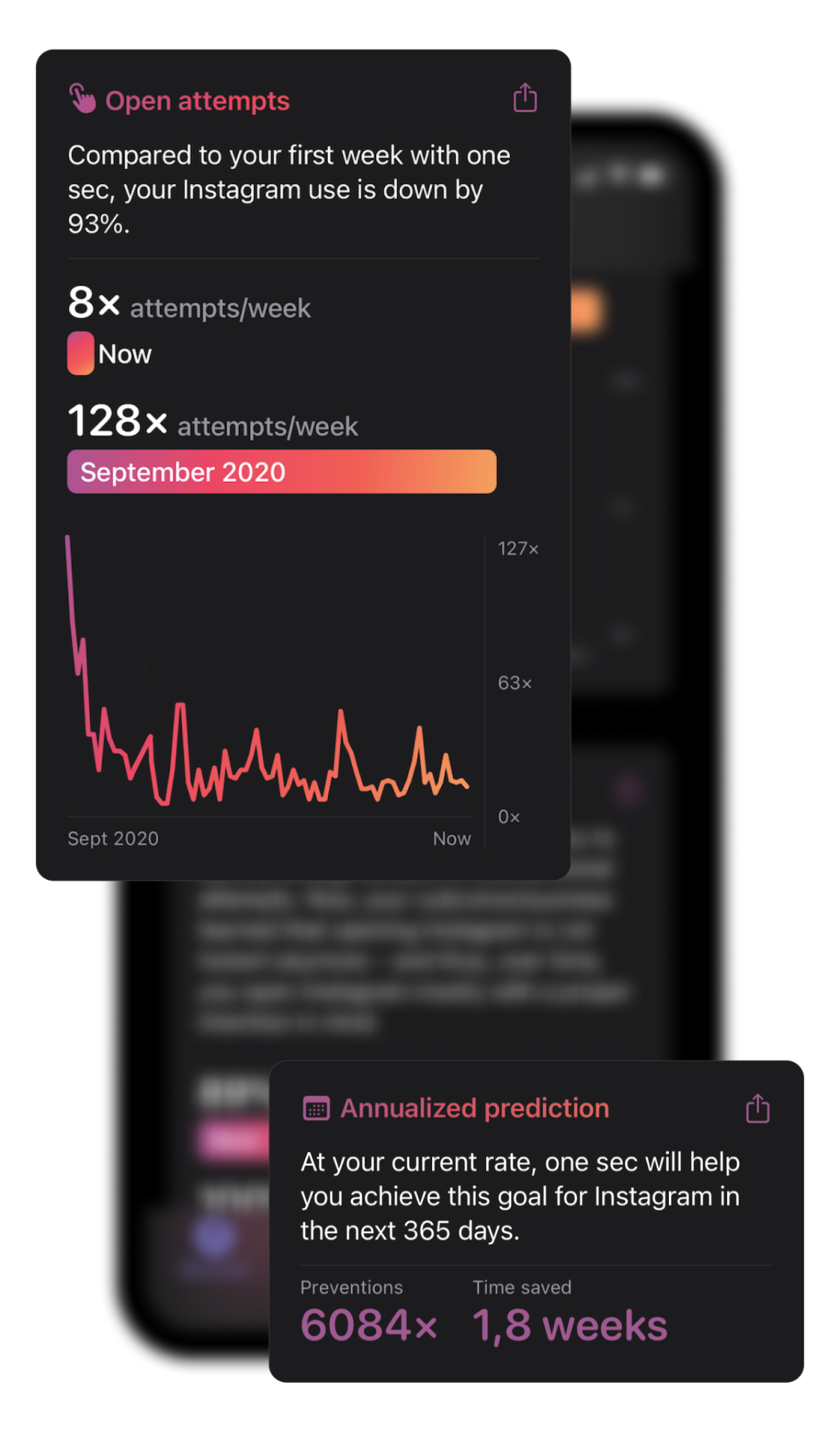 After using one sec for a couple of weeks, users can see how much time they have saved with one sec. In my case, I save two full weeks every year by spending way less time on Instagram and Twitter.