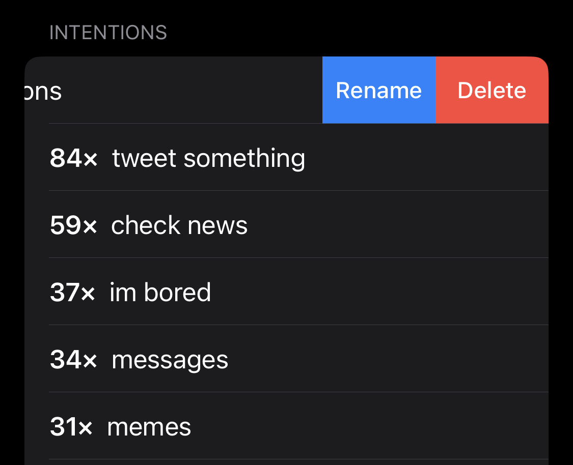 Go to the detail page of the app in one sec for which you would like to edit intentions. Scroll down to the intention section. Then swipe left to unveil the edit / deletion menu.