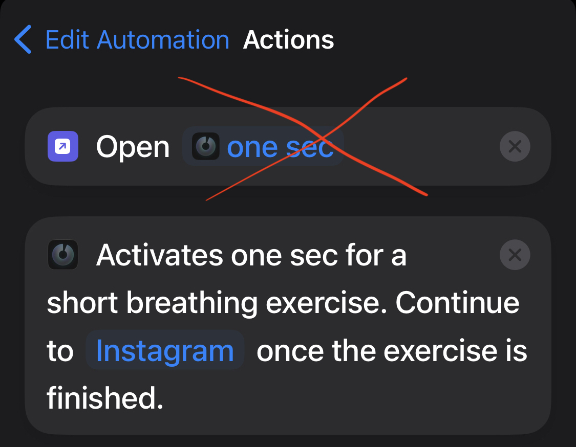 It’s very likely that you’ve accidentally added an “Open App” Shortcut Action before the actual one sec Shortcut Action. Please remove the “Open App” Action and one sec should behave as expected: